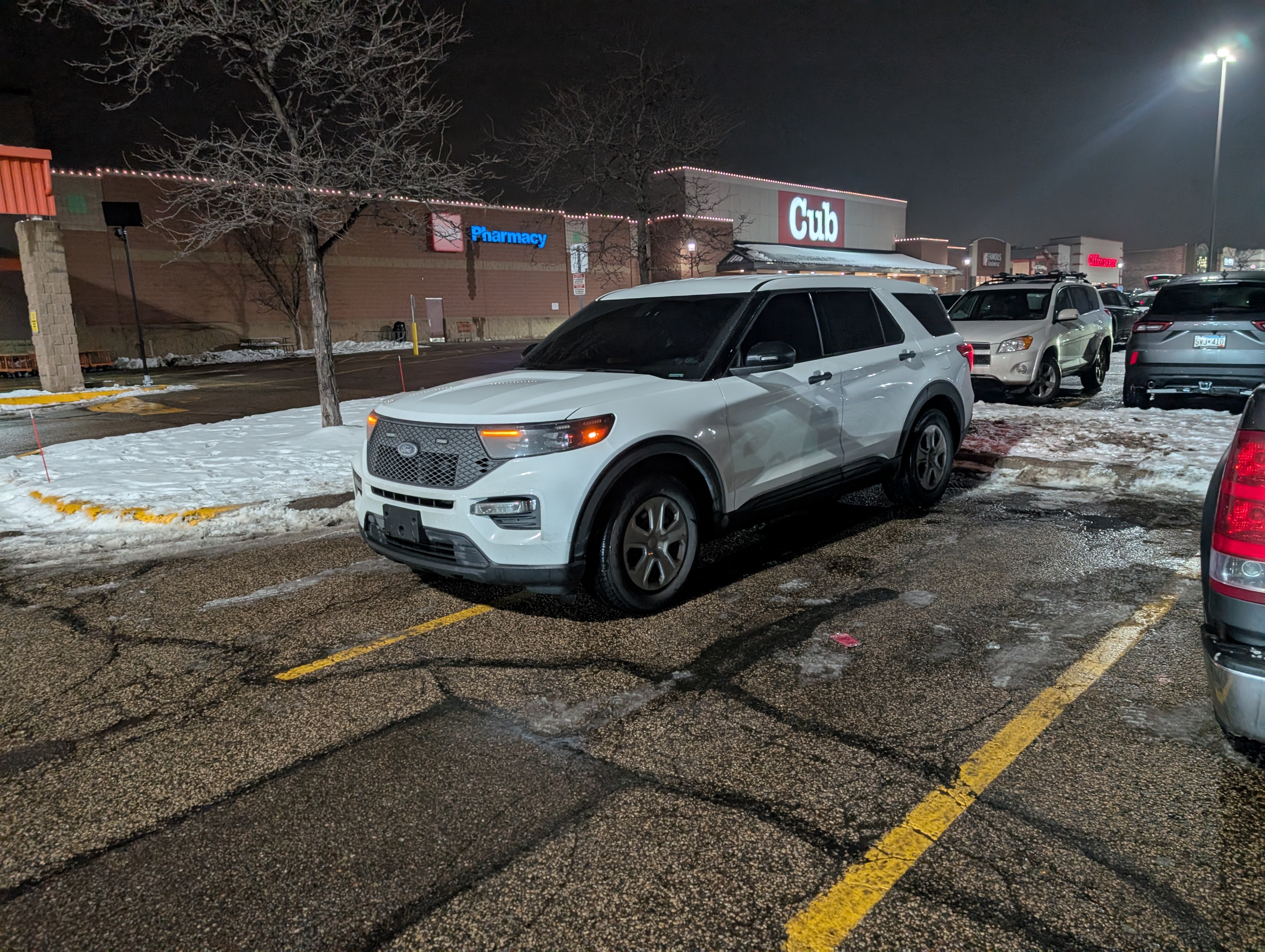 5 or 6 unmarked cars (white jeep and multiple silver suvs among them) huddled around a car in the estrella super market .. more